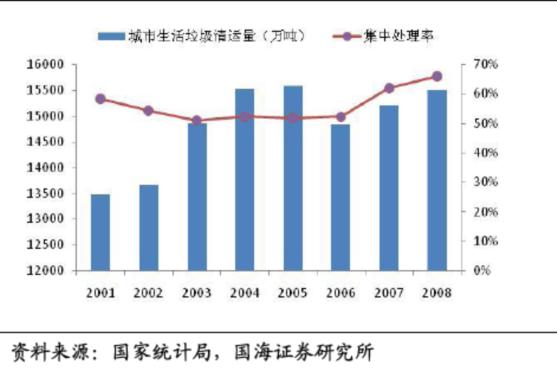近年來,我國的生活垃圾清運量基本維持在1.5億噸左右。生活垃圾的主要處理方式有衛(wèi)生填埋、堆肥、焚燒等方式。2007年全國生活垃圾處理設施共460個,其中衛(wèi)生填埋有366個,堆肥17個,垃圾焚燒66個。03年到07年間,填埋廠的數量呈下降趨勢,從575個減少到366個;堆肥廠的數量從70個減少到17個;而焚燒廠則從47個增加到66個。垃圾焚燒將會逐漸成為生活垃圾處理的主流方式。 我國的環(huán)境治理投資主要可分為三個方向:城市環(huán)境基礎設施投資、工業(yè)污染治理投資、建設項目“三同時”環(huán)保投資,三者的比重大致為4:2:4。在城市環(huán)境基礎設施投資中,固廢治理的投資占比為4%;在工業(yè)污染治理投資中,固廢治理投資占比6%;在“三同時”投資中,固廢治理投資占比為8%。則固廢處理在環(huán)境治理投資總額中的占比約為6%。然而隨著城市垃圾問題的日益嚴重,有專家基于03-07年的數據預測,固廢處理投資在環(huán)境治理投資結構比重將由6%提升至8%。受益于“調結構”的經濟發(fā)展主基調,固廢行業(yè)進入黃金發(fā)展期。“十一五”期間,固廢處理投資規(guī)模2100億,年均增速18.5%,而環(huán)保部中國環(huán)境規(guī)劃院預測“十二五”期間,固廢行業(yè)達到8000億,同比十一五翻兩番,固廢行業(yè)進入持續(xù)10年以上的黃金發(fā)展期。 我國的環(huán)保產業(yè)發(fā)端于“七五”期間,隨著國民經濟的快速增長,我國的環(huán)保投入也持續(xù)高速增長。按照規(guī)劃,“十二五”期間中國環(huán)保投資將達3.1萬億,較“十一五”期間1.54萬億的投資額上升121%,年平均增速達24.2%,環(huán)保投資力度的加大促進行業(yè)的高速發(fā)展。中國環(huán)保投資占GDP的比重自2001年的1.01%提升至2008年的1.43%,所處的水平與美國環(huán)保產業(yè)80年代水平相當,該階段為美國環(huán)保產業(yè)高速發(fā)展的后半段,環(huán)保產生的增速約為GDP增速的兩倍,因此,若是中國GDP保持8%的增速,2015年環(huán)保投資/GDP提升至2.5%,則2015年中國環(huán)保投資額將達1.35萬億,2008-2015年復合增長率可至16.97%。 “十一五”期間,中國固廢處理投資規(guī)模2100 億,年均增速18.5%,其中的垃圾處理以25%的增速位列環(huán)保投資之首,但固體廢物處理問題依舊在惡化,因此中國固廢處理投資規(guī)模需繼續(xù)加大以抑制這種趨勢。而作為環(huán)保產業(yè)的重要一環(huán),與污水處理和大氣處理相比,中國目前固廢處理行業(yè)仍處于初始階段,產業(yè)化程度和市場集中度均非常低,隨著投資規(guī)模的快速加大,固廢處理行業(yè)也必將高速發(fā)展。 業(yè)界知名機構EBJ曾將環(huán)保行業(yè)發(fā)展分為4個階段:市場初步發(fā)展階段、環(huán);A設施發(fā)展階段、加強監(jiān)管階段以及成熟穩(wěn)定期。中國現在處于第二階段,即環(huán);A設施發(fā)展階段。目前中國環(huán)保業(yè)的主要驅動因素有重工業(yè)化、城市化和高污染引發(fā)的環(huán)保需求。固體廢物處理行業(yè)是環(huán)保產業(yè)的主要子行業(yè)之一,是指提供一系列產品和服務來測量、防止、限制和減弱因固體廢物引起的各種問題的行業(yè)。 固體廢物可以分為工業(yè)固廢、生活垃圾及危險廢物,而后者的數量比重很小。2001年至2009年間,工業(yè)固廢的產生量從約9億噸激增到約21億噸,年均復合增長率達到12%。由于生活垃圾的產生量比較難統(tǒng)計,在統(tǒng)計局給出的數據中一般用垃圾清運量指標來代替。生活垃圾的實際產生量約為清運量的兩倍,且清運比逐年上升趨勢。2001-2008年,城市垃圾產量復合增長率為5%,而垃圾清運量的增速僅為2.03%,整體來看,垃圾清運的速度不及垃圾產生的速度,垃圾圍城現象出現,垃圾處理問題開始引起民眾和政府的高度重視。截止2007年,我國未經處理的城市生活垃圾累計堆存量已達70多億噸,侵占土地面積超過5億多平方米,全國660個城市中有約200個城市陷入垃圾包圍之中。深圳市創(chuàng)新投資集團有限公司發(fā)展 我國固廢處置行業(yè)起步較晚。目前的競爭狀況:一是產業(yè)化程度和市場集中度還非常低;二是由于固廢行業(yè)尚處初期階段和處置技術工藝較復雜等多種因素,競爭格局尚沒有最終確立,市場競爭處于無序狀態(tài)。 目前優(yōu)勢競爭者數量有限。我國固廢傳統(tǒng)上采用填埋工藝,新興的堆肥、焚燒法處置固廢都屬于新興產業(yè),目前來看,這兩個市場核心環(huán)節(jié)競爭參與者數量都較為有限。生活垃圾焚燒領域,金州環(huán)境、光大國際、天津泰達、首創(chuàng)集團、上海環(huán)投、威立雅、桑德環(huán)境(原合加資源)、偉明環(huán)保、豐泉環(huán)保、深圳綠動力、杭州錦江等十余家企業(yè)目前瓜分了整個市場;堆肥法下,目前僅桑德環(huán)境屬于大型企業(yè)。從競爭格局來看,總體上,這一領域具備相當實力的競爭者數量依然有限,其中,桑德環(huán)境、金州環(huán)境、偉明環(huán)保等非國有企業(yè)立足于先發(fā)優(yōu)勢、技術和機制優(yōu)勢競爭實力日益突出,而幾大城市環(huán)衛(wèi)集團借助于資金和地域優(yōu)勢和引進海外合作方,在大型項目上也占據了一定市場份額。
